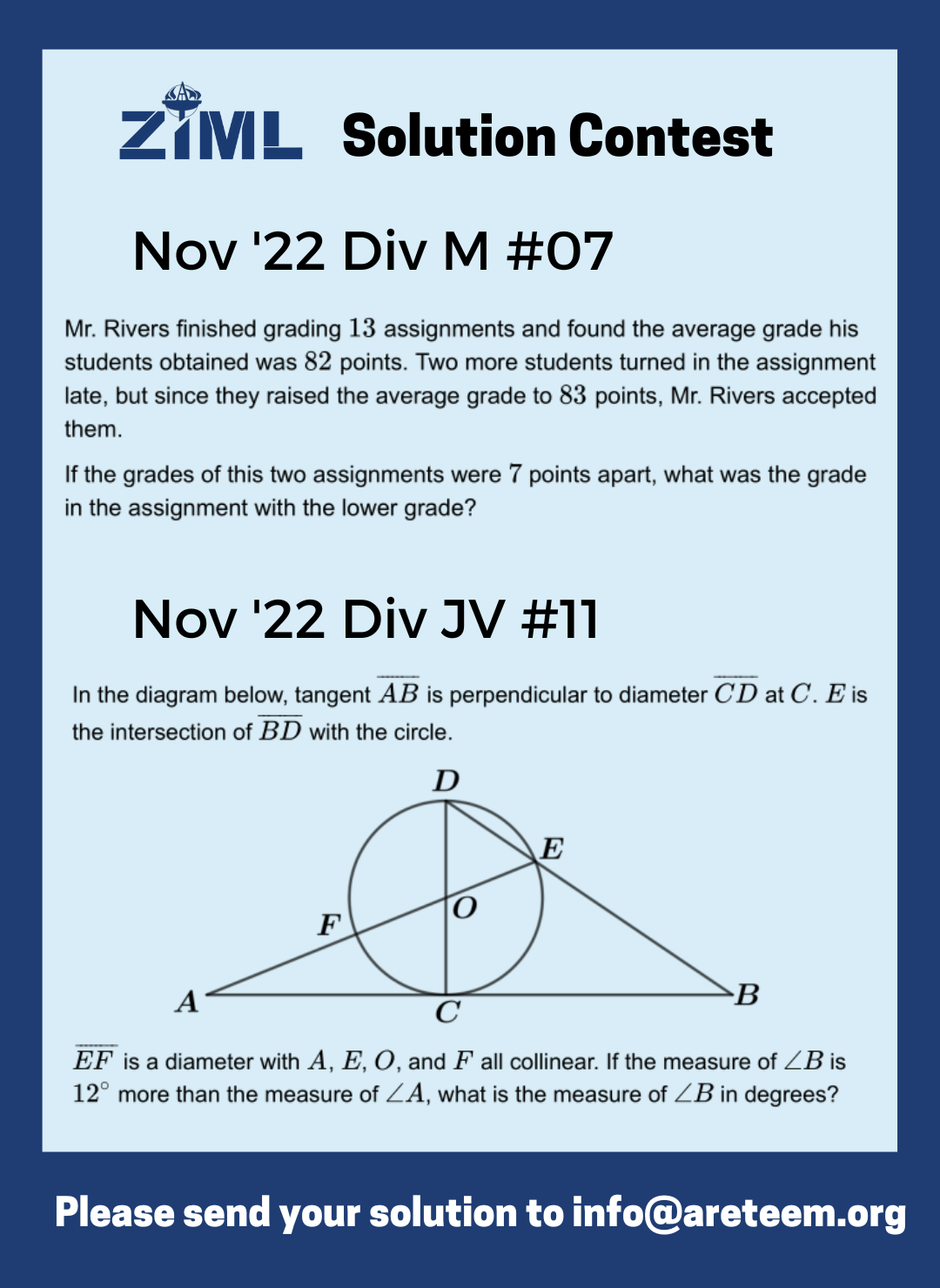 We're showcasing student work and solutions in with our solution contests featuring problems from the Online ZIML Monthly Contests. Be sure to follow us on social media (Facebook, Twitter, WeChat, etc.) for updates and information about the next contest!